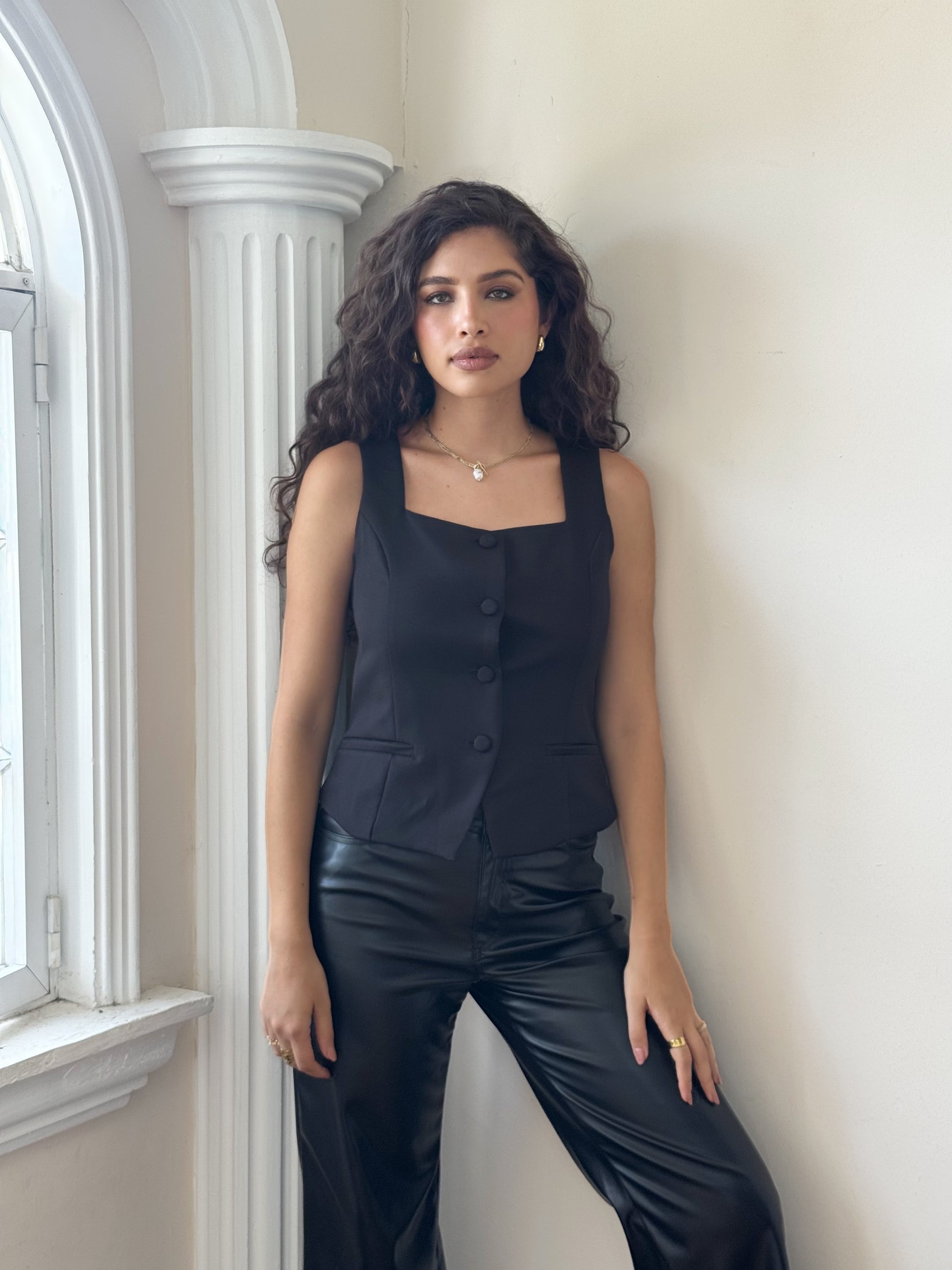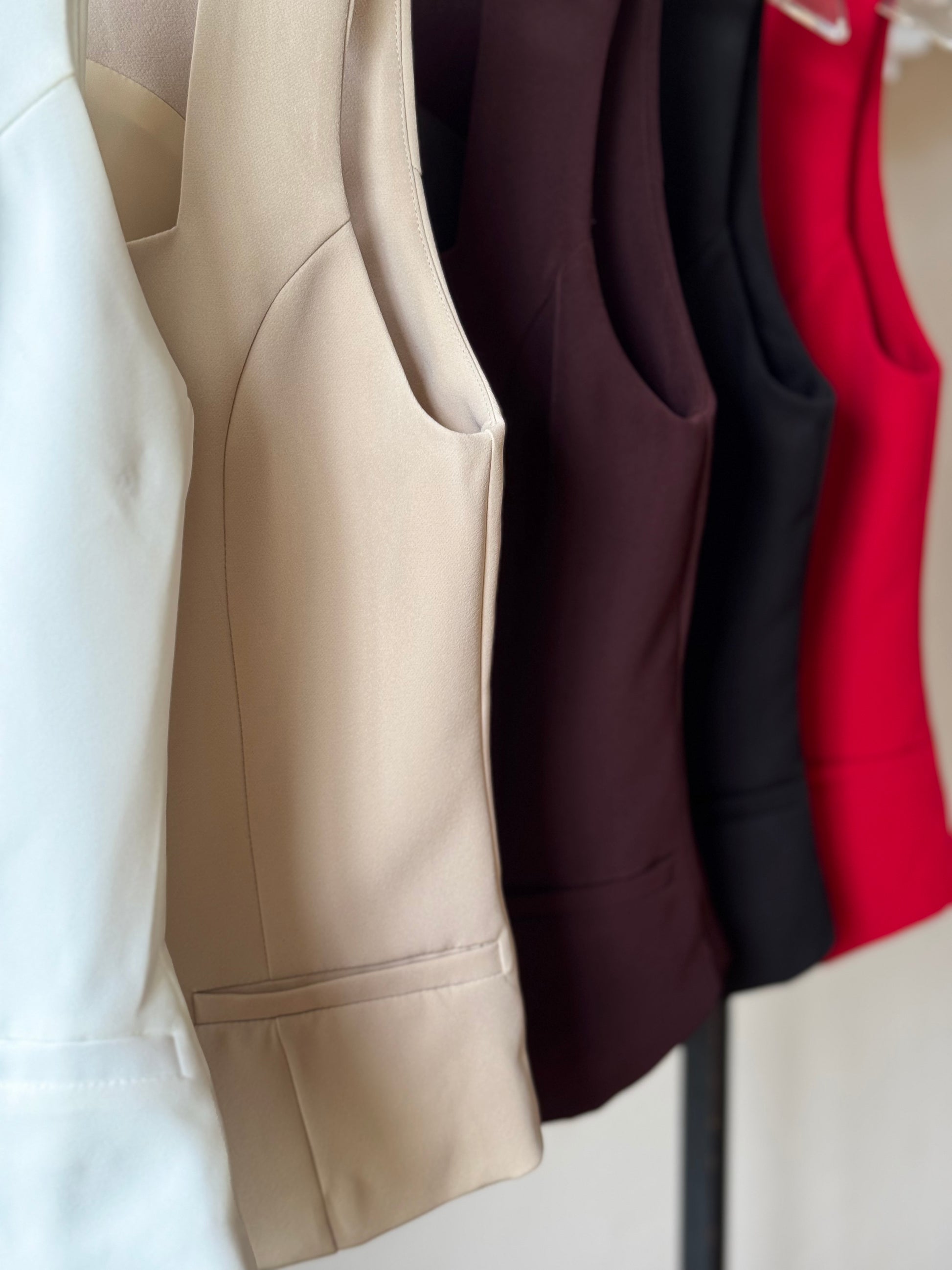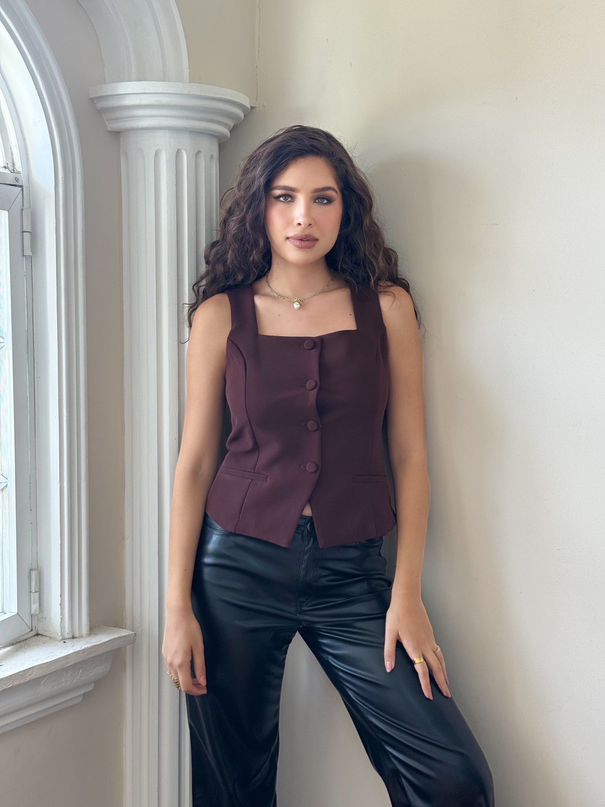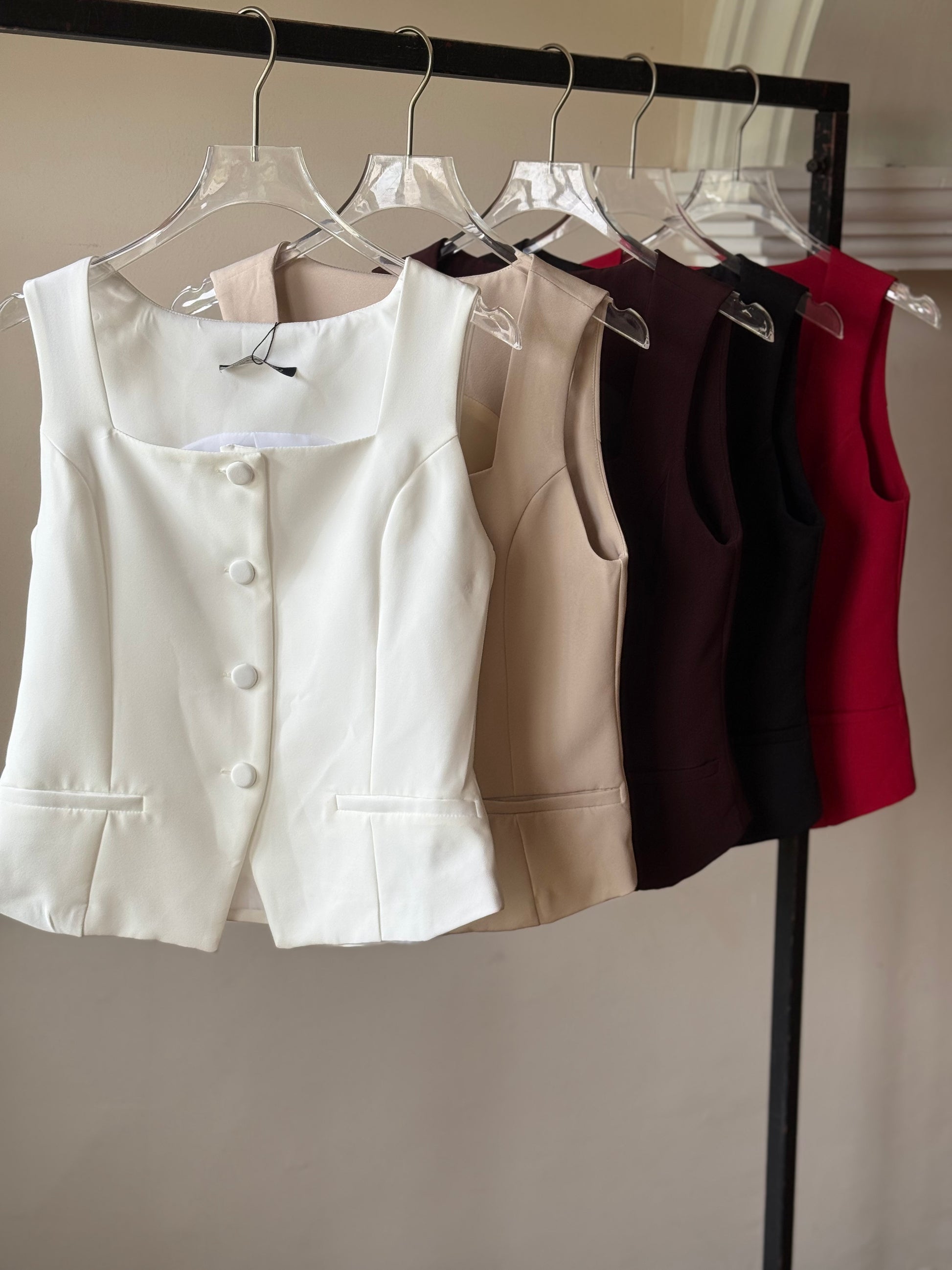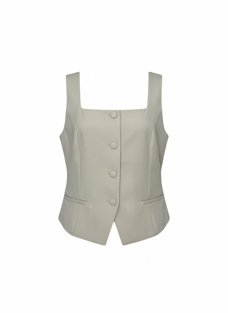 Este chaleco de escote cuadrado, confeccionado en elegante tela de vestir, aporta un toque sofisticado y moderno a cualquier atuendo. Su diseño estructurado realza la silueta, ofreciendo un estilo impecable para ocasiones formales o profesionales. Ideal para quienes buscan combinar comodidad con distinción en una prenda versátil y de calidad.