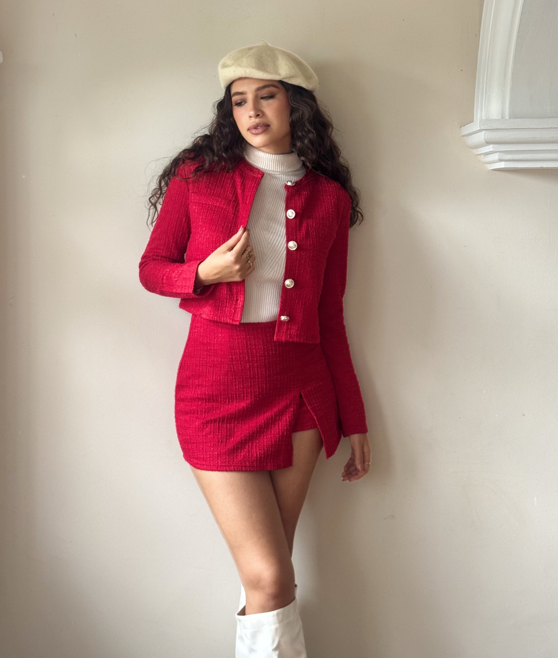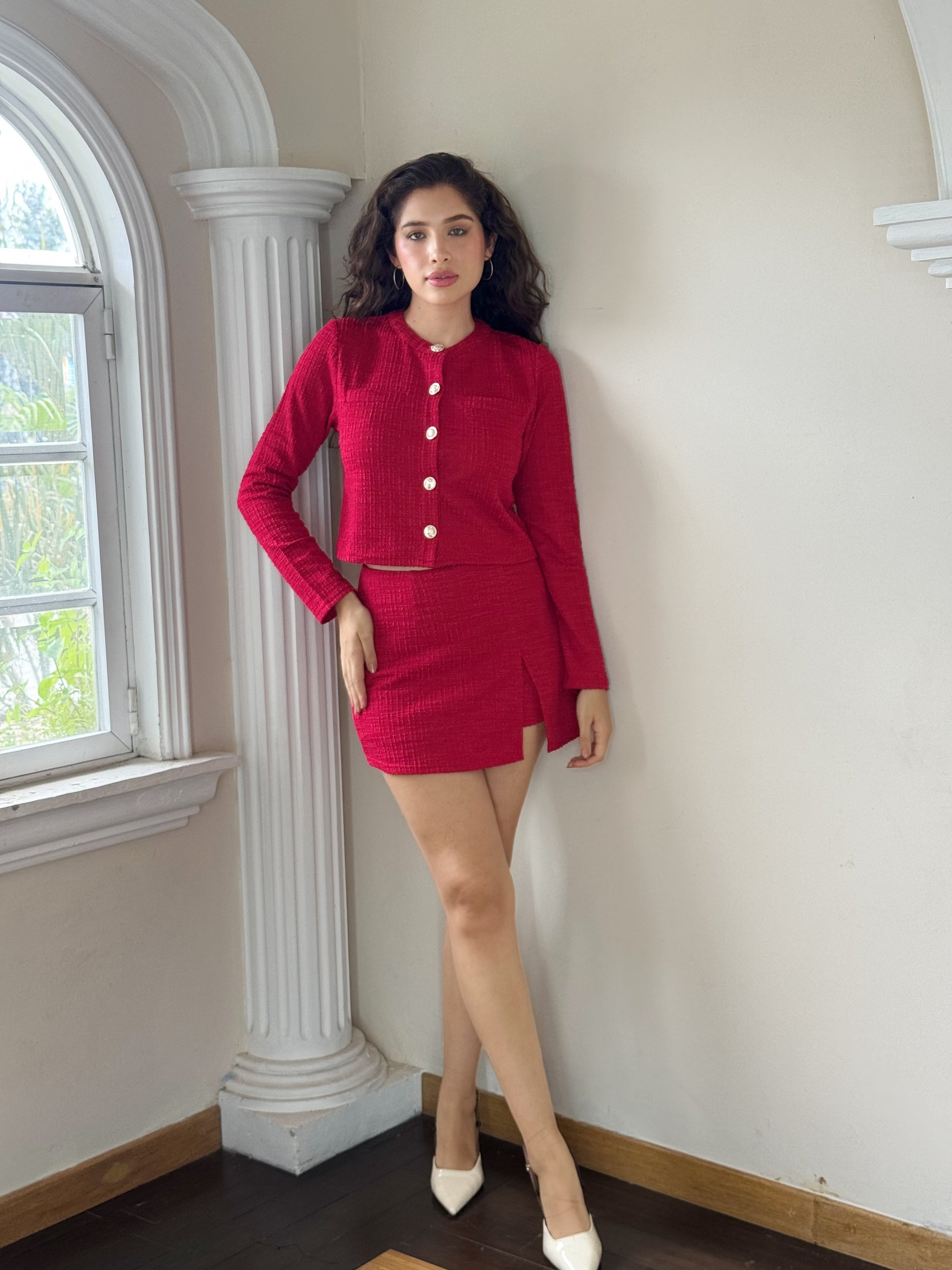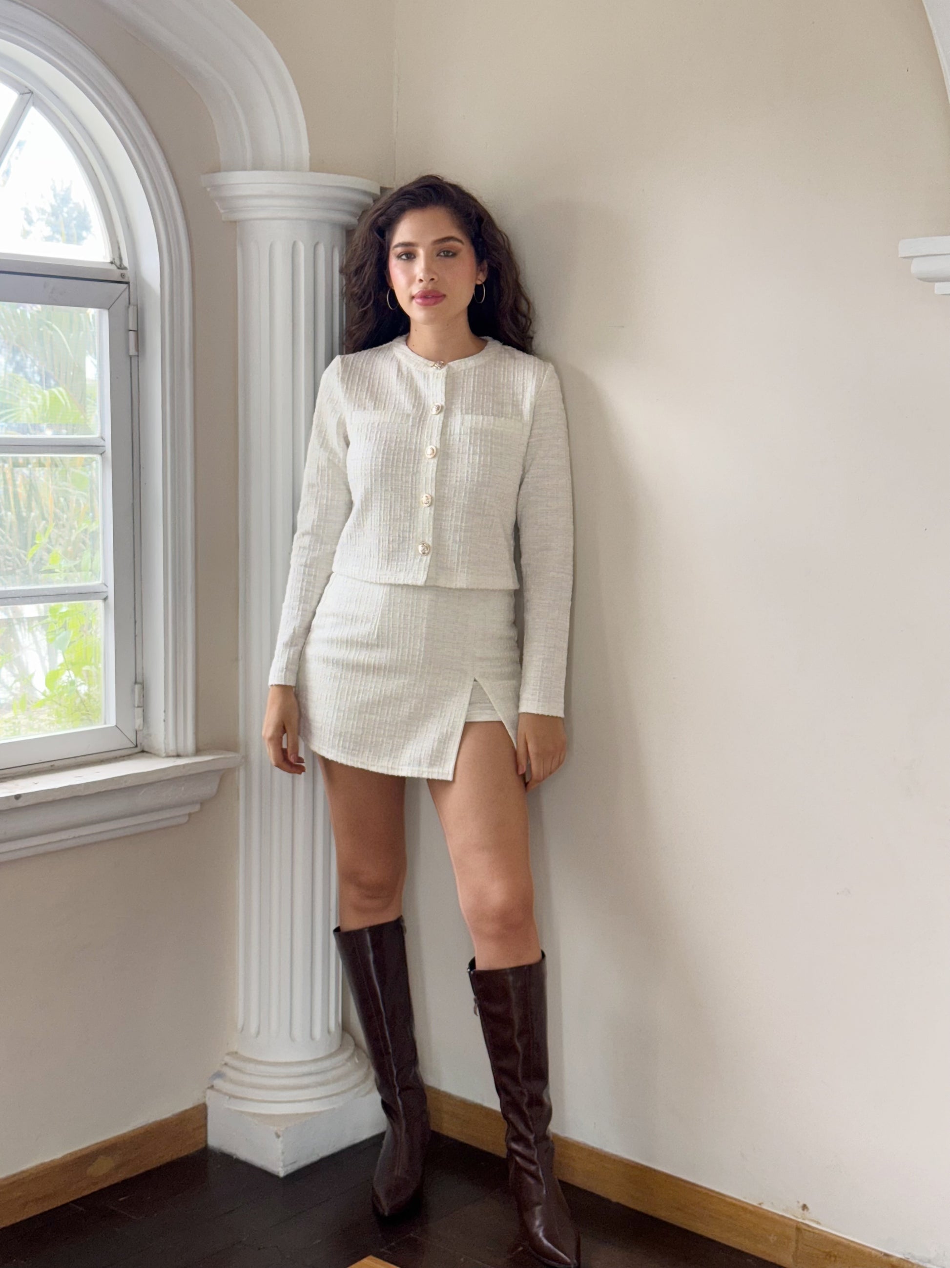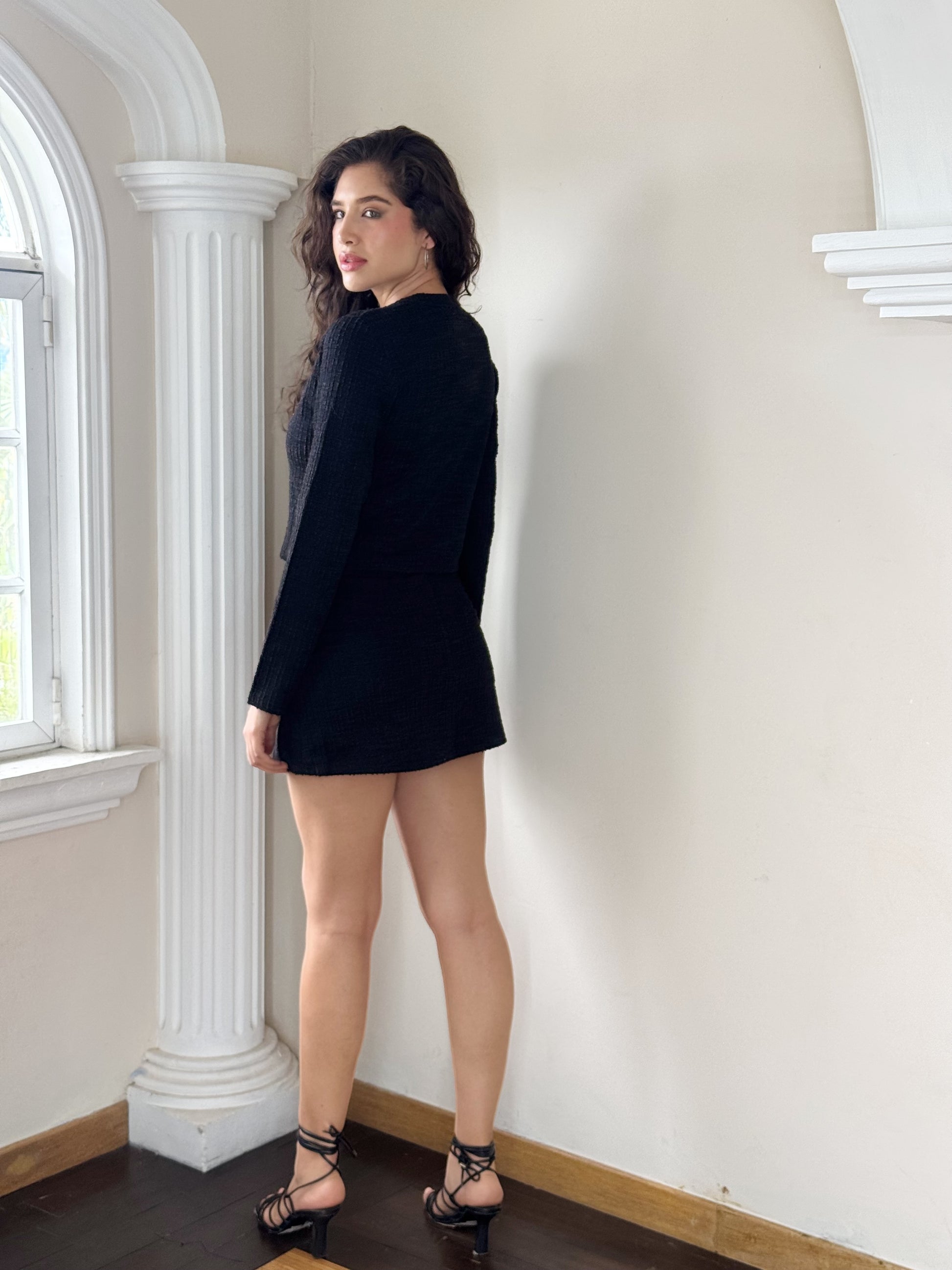 Este conjunto tweed con brillos combina elegancia y estilo moderno en una falda short y un squito crop. Perfecto para destacar en cualquier ocasión, su diseño sofisticado realza tu figura mientras el tejido con brillo aporta un toque de glamour sutil. Ideal para quienes buscan una apariencia chic y cómoda al mismo tiempo.