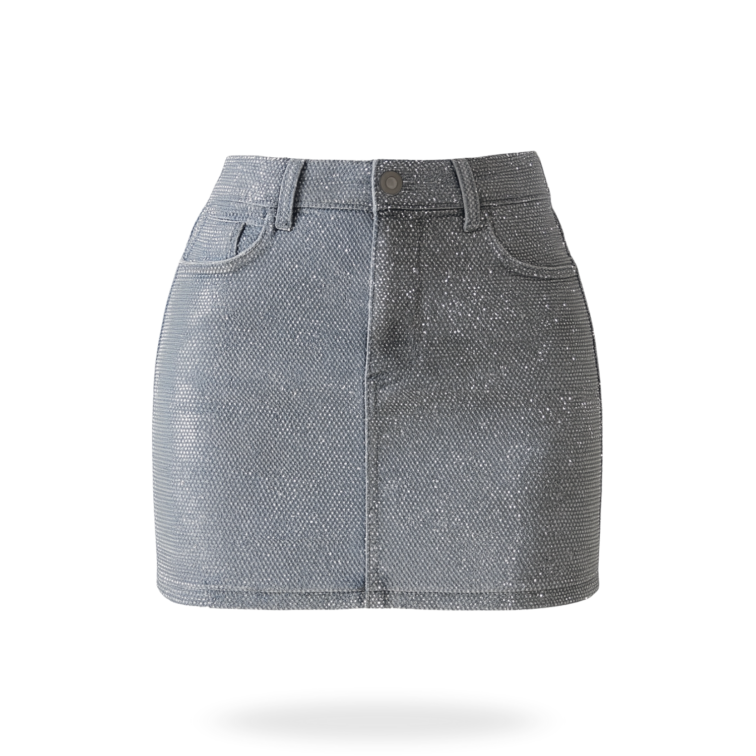 Esta mini falda de mezclilla con brillos es perfecta para lucir a la moda y elegante. Su diseño moderno con detalles brillantes le dará un toque único a tu atuendo. Además, su duradera tela de mezclilla es ideal para un uso diario cómodo. Lleva tu estilo al siguiente nivel con esta falda.