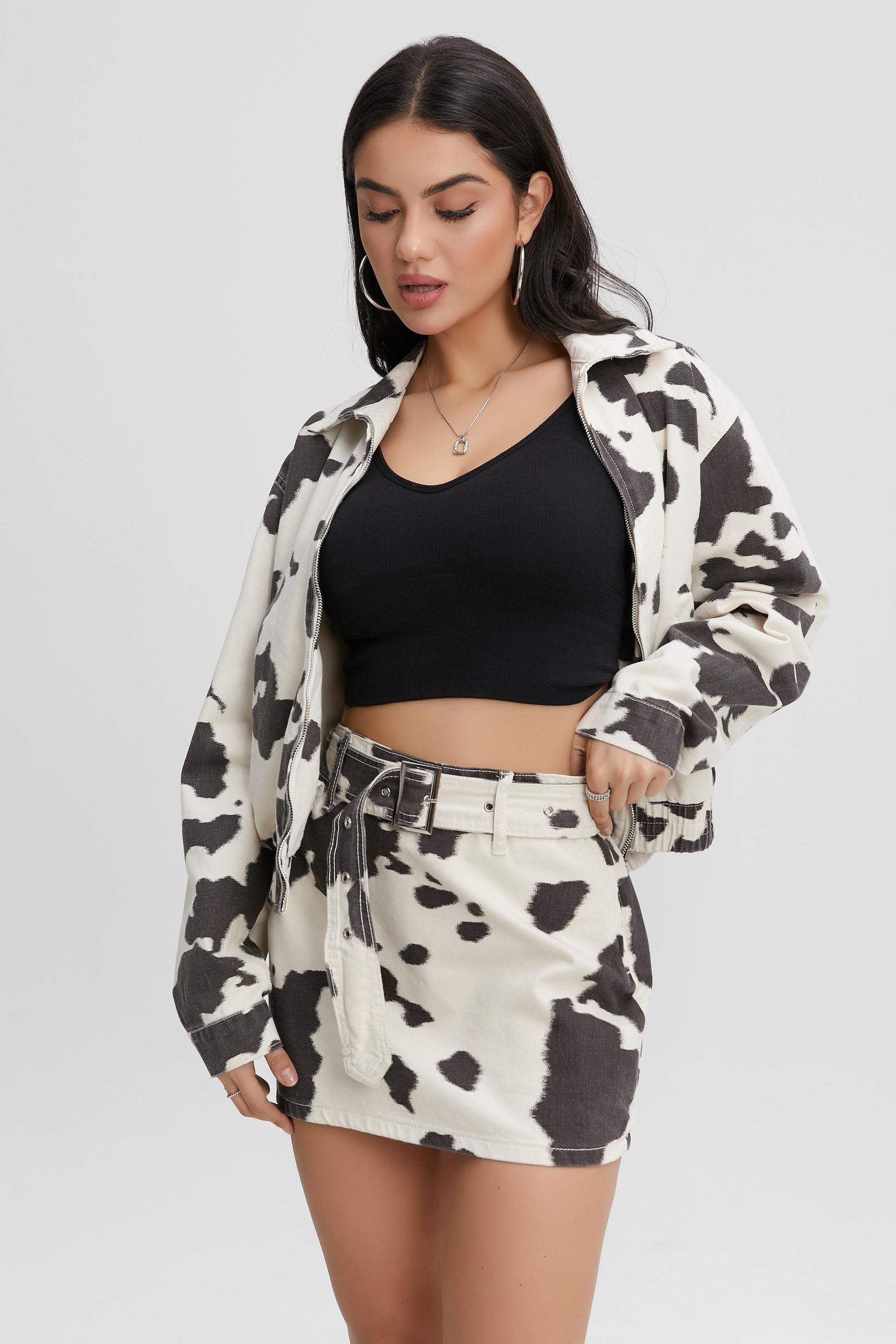 Esta elegante falda corta de mezclilla cuenta con un moderno estampado de vaca y un short incorporado en la parte inferior para mayor comodidad y cobertura. Perfecta para un look casual o festivo con un toque único y divertido. ¡Luce a la moda con esta falda de vaca!