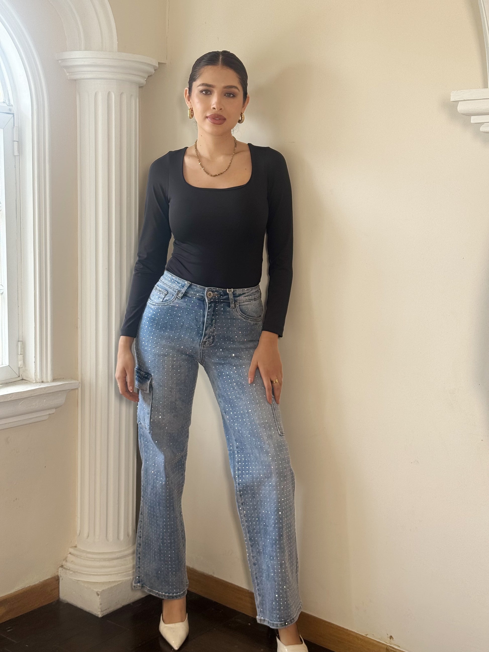 Este pantalón cargo está diseñado con un tejido strech que proporciona comodidad y libertad de movimiento, ideal para un estilo de vida activo. Además, su acabado con brillos le da un toque único y moderno. ¡Perfecto para combinar comodidad y estilo en tus aventuras diarias!