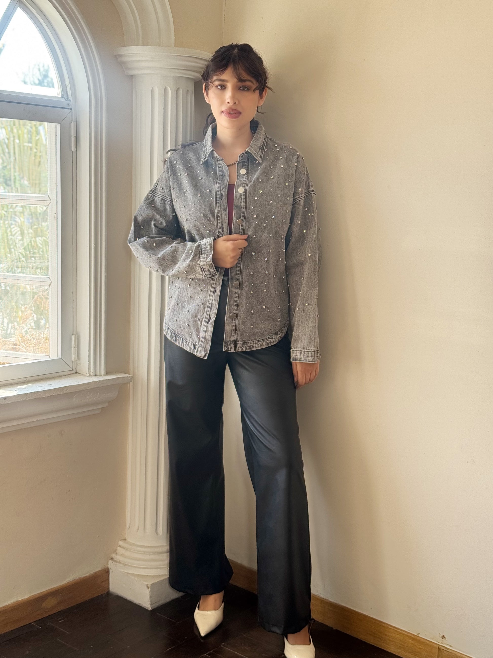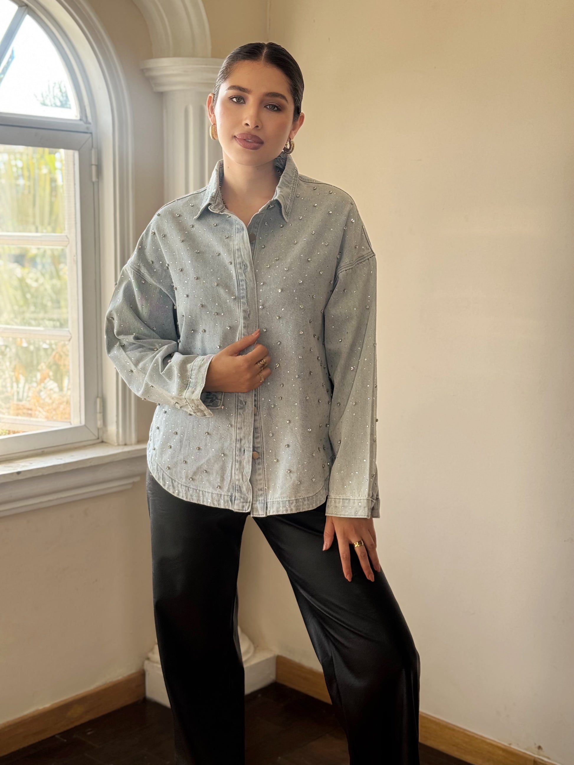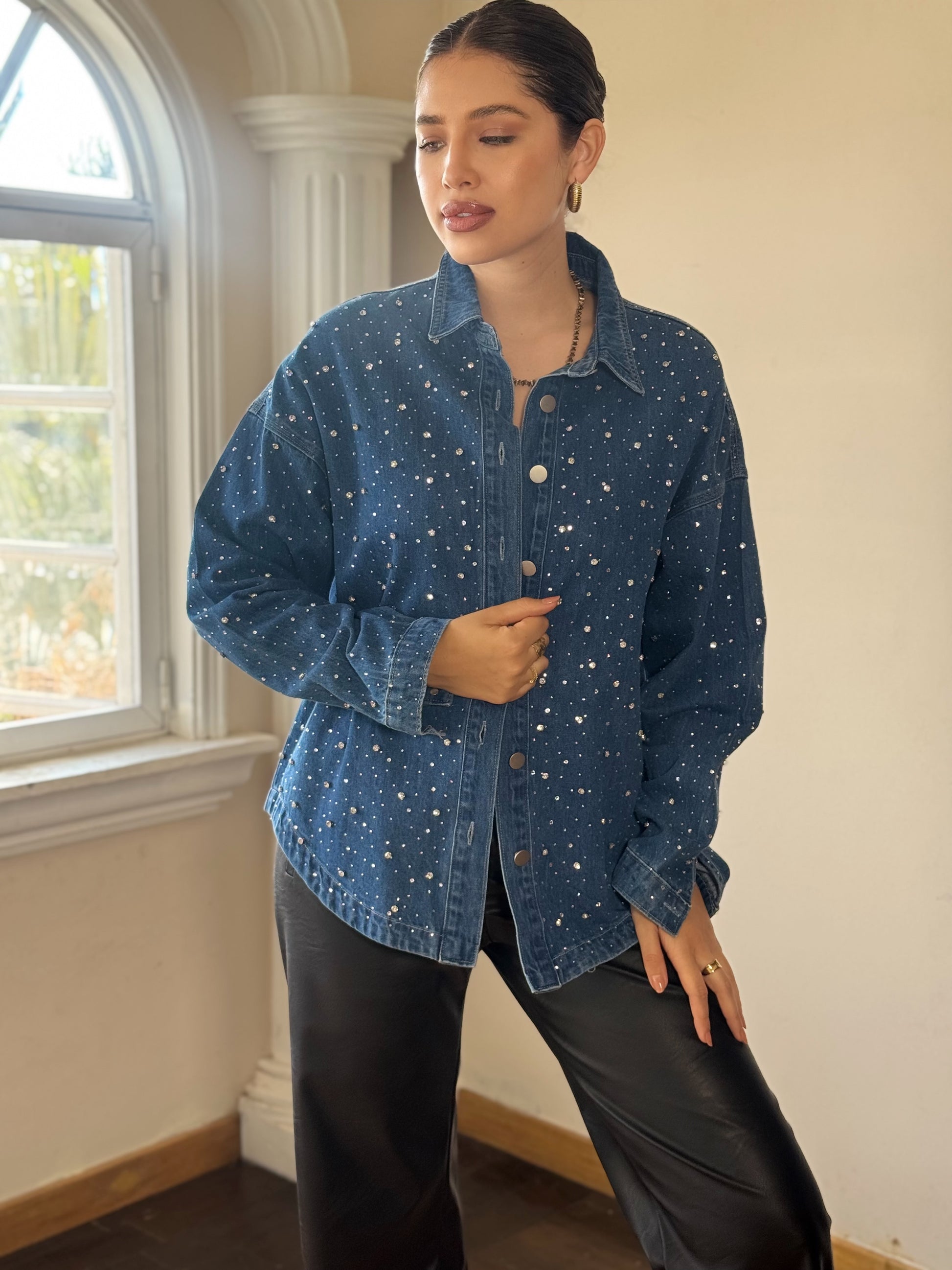 Expresa tu estilo único con nuestra camisa de mezclilla con brillos. Confeccionada con tejido de alta calidad, esta sobre camisa agrega un toque de brillo a tu atuendo. Su diseño elegante y moderno es perfecto para cualquier ocasión. ¡Atrévete a brillar con nuestra camisa de mezclilla!